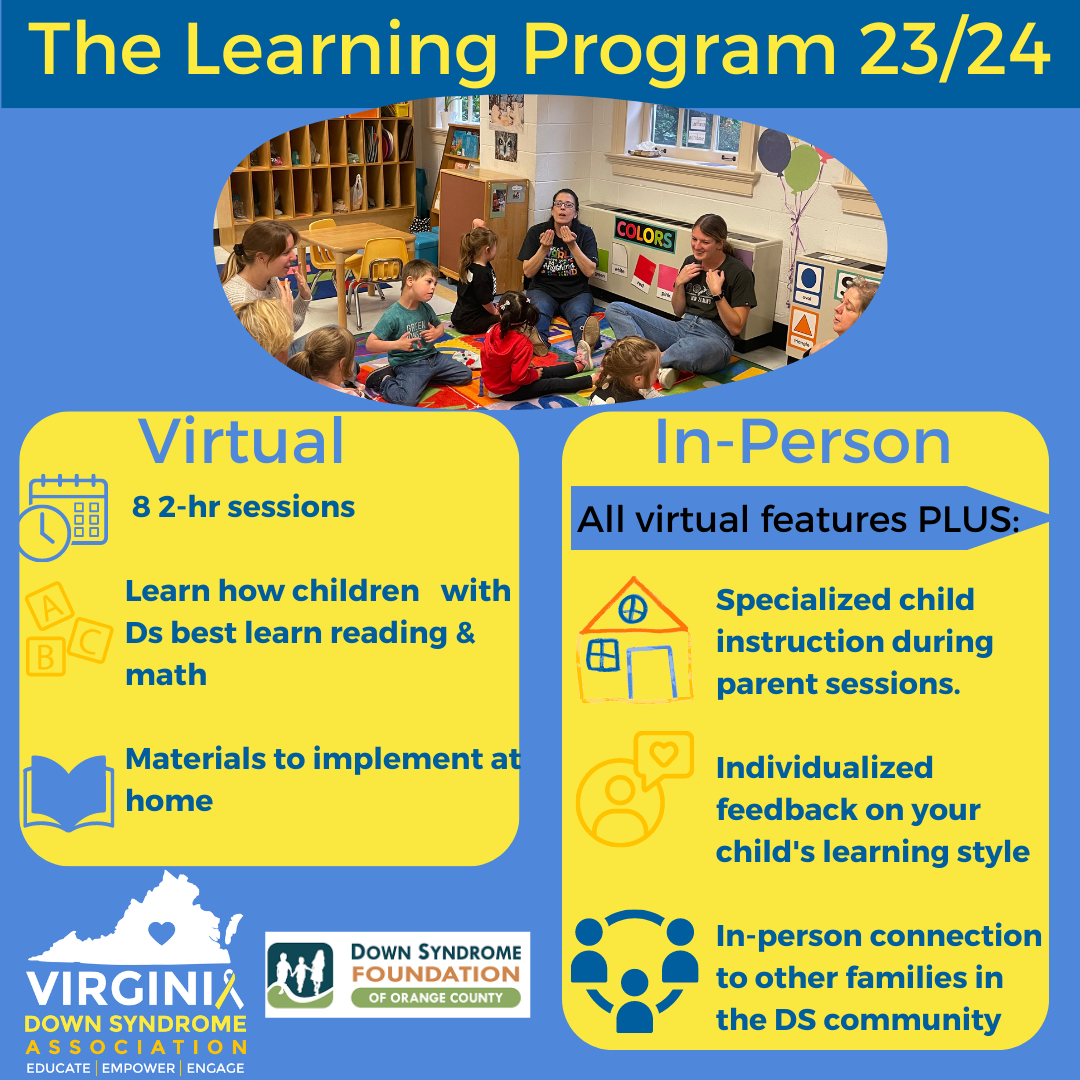 A virtual series with information and resources to answer your questions about the 1st year of development for children with Down syndrome. Each week, you will learn from professionals in speech & language, sensory, physical therapy, oral motor & feeding, fine motor development, physical therapy, behavior/social, and vision and hearing. This program is available to any member of VDSA!